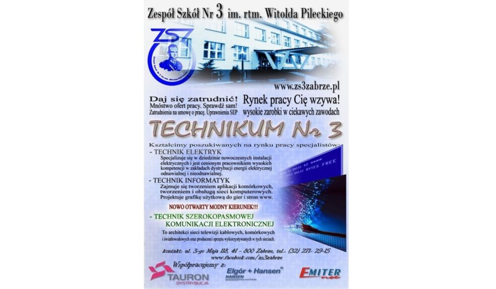 Zespół Szkół Nr 3 im. rtm. Witolda Pileckiego w Zabrzu jest szkołą, która odpowiada na potrzeby rynku pracy. Absolwenci tej szkoły w przyszłości bez problemu znajdą zatrudnienie. Szkoła rozpoczyna nabór na rok 2017/2018 w zawodach: technik elektryk, technik informatyk, technik szerokopasmowej komunikacji elektronicznej. Gwarantują one ciekawą pracę i wysokie zarobki.