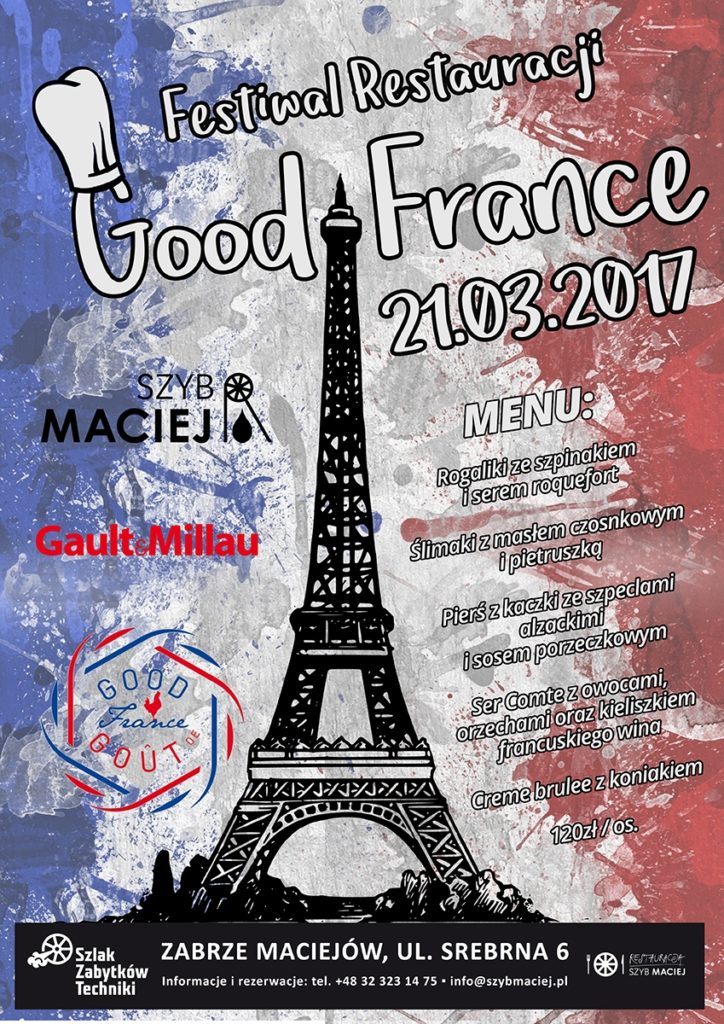 W każdej restauracji, która weźmie udział w tym projekcie, specjalnie przygotowana kolacja będzie hołdem dla wyśmienitej francuskiej sztuki kulinarnej, dla jej odkrywczego charakteru i dla wartości, których jest przekazicielem: chodzi o idee dzielenia się, wspólnie przeżywanej przyjemności, uznania dla dobrej żywności. Restauracja Szyb Maciej w ramach Festiwalu proponuje: rogaliki ze szpinakiem i serem roquefort; ślimaki z masłem czosnkowym i pietruszką; pierś kaczki ze szpeclami alzackimi i sosem porzeczkowym; ser Comte z owocami, orzechami oraz kieliszkiem francuskiego wina; creme brulee z koniakiem. Menu w cenie 120zł/os. dostępne w tym dniu wyłącznie w Restauracji Szyb Maciej. Rezerwacje – tel. +48 32 323 14 76