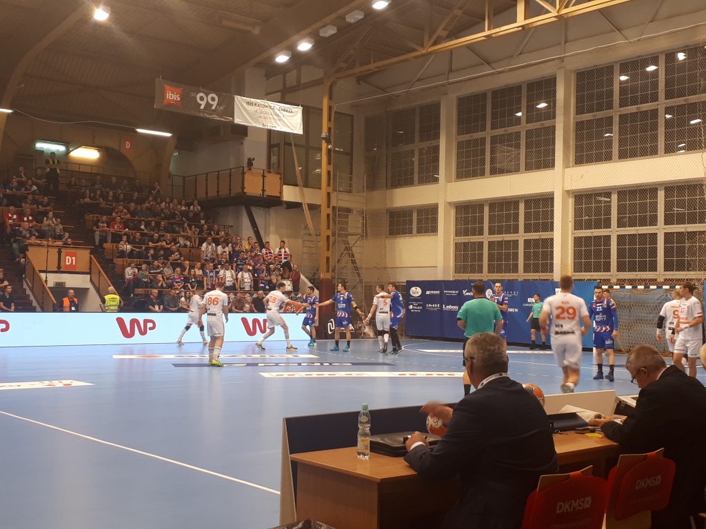 Gospodarze tego spotkania po poprzedniej wygranej z wicemistrzem Polski Orlenem Wisłą Płock liczyli na kolejną, tym razem z Azotami Puławy. Kibice nie zawiedli, wypełniając szczelnie halę „Pogoń”. Pierwszą bramkę zdobyli zawodnicy z Zabrza, jednak następne dwie przyjezdni z Puław. Początek spotkania to wymiany z obu stron do momentu efektownej „wkrętki” Bartłomieja Tomczaka z lewego skrzydła, kiedy to gospodarze wyszli na dwubramkową przewagę (6:4). W bramce świetnie spisywał się Mateusz Kornecki. Było już 9:6, gdy doszli do głosu puławianie, którzy rzucili aż cztery bramki z rzędu. Trener Zabrzan wziął czas, by przerwać tę serię gości i był to dobry ruch z jego strony, ponieważ jego podopieczni szybko wyrównali i po kolejnej bramce Tomczaka było już 11:10. Końcówka pierwszej połowy należała do gospodarzy, którzy wygrali ją i ostatecznie to oni schodzili na przerwę przy stanie 15:13.
