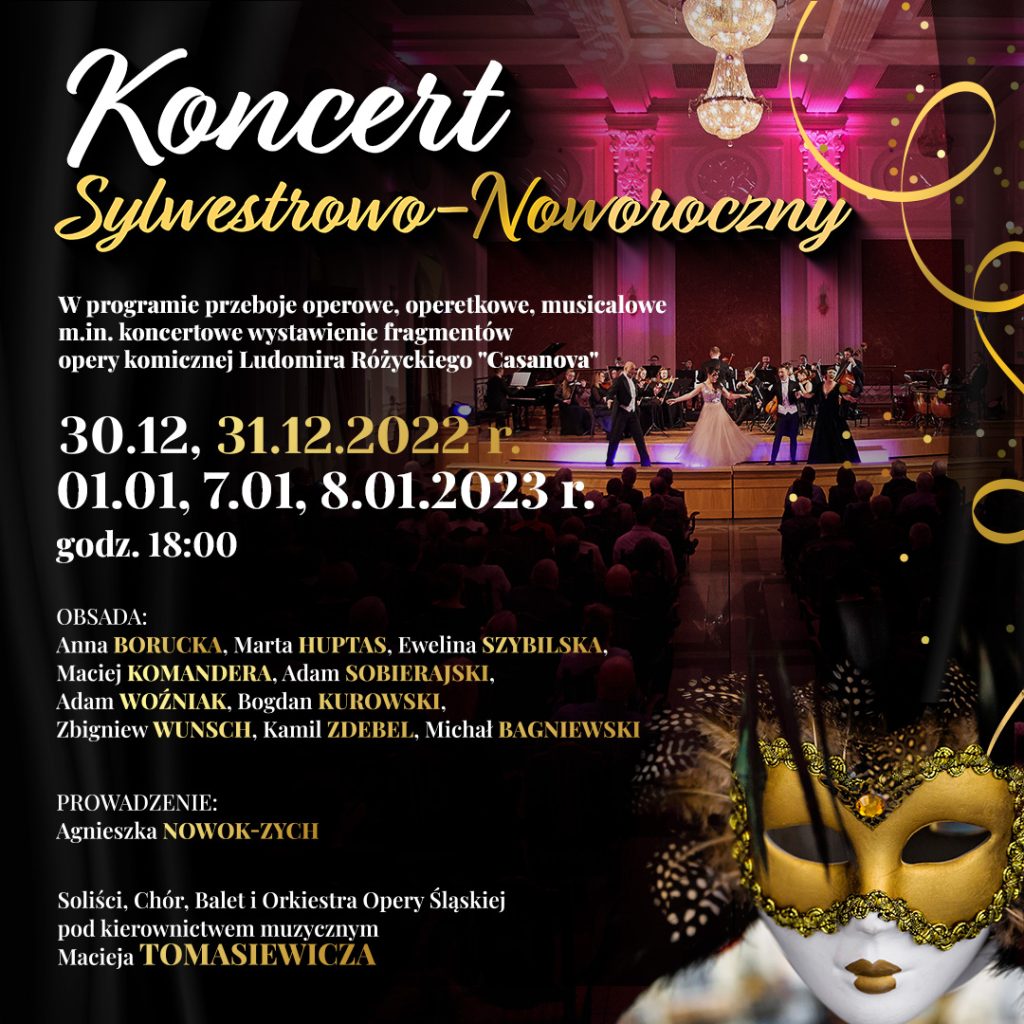 Ten rok zakończymy z wysokiego C. Zapraszamy na wyjątkowy i niezapomniany program noworoczny – pełen elegancji, szyku, dobrego humoru i doskonałej muzyki. Artyści zabiorą melomanów w przepiękną muzyczną podróż szlakiem uwielbianych przebojów operowych, operetkowych i musicalowych. Usłyszymy m.in. fragmenty „Carmen” G. Bizeta, „Księżniczki czardasza” I. Kalmana, “Włoszki w Algierze” G. Rossiniego, „Barona cygańskiego” oraz kadryle J. i E. Straussa. Wielką gratką dla melomanów będą zapewne tańce symfoniczne ze „Skrzypka na dachu” oraz kompozycje W. Kilara.