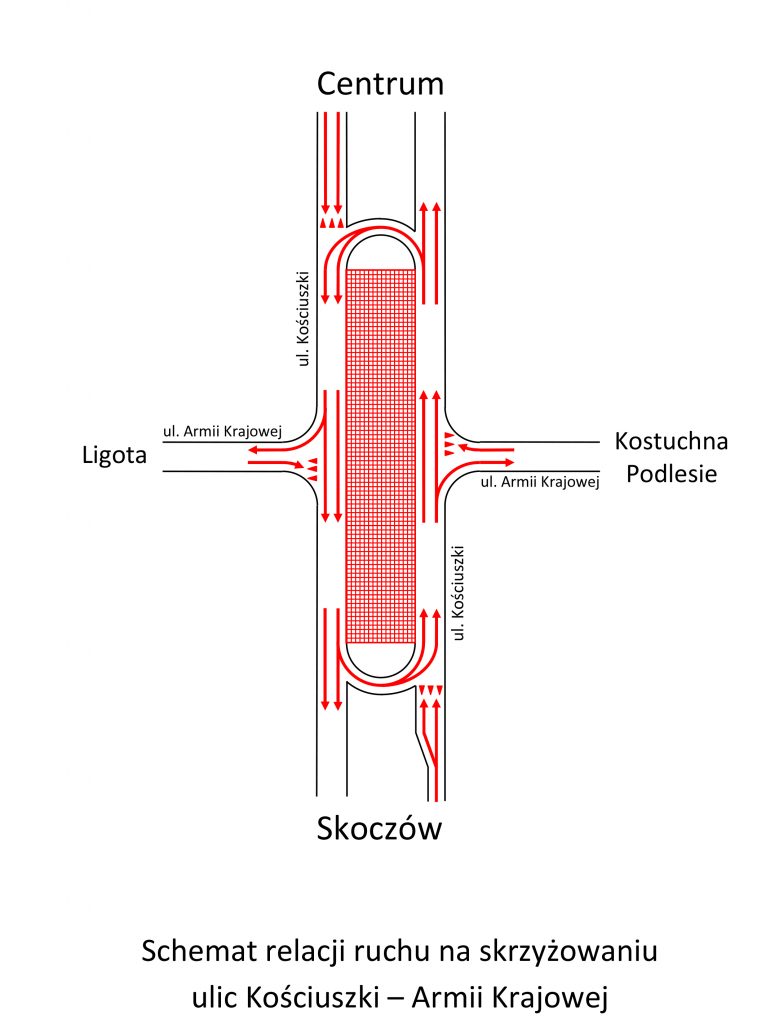 – Od 7 października do końca lutego przyszłego roku w związku z budową wiaduktów, kładek oraz tunelu ruch poprowadzony będzie na zasadzie skrzyżowania z wyspą centralną, czyli kierowcy jadący ul. Armii Krajowej od strony Piotrowic chcąc pojechać w stronę Ligoty będą musieli skręcić w prawo, by przejechać nowowybudowaną łącznicą, zrobić nawrotkę i skręcić w prawo z powrotem w ul. Armii Krajowej. Analogiczne rozwiązanie będzie obowiązywało dla kierowców poruszających się w odwrotnym kierunku – wyjaśnia Ewa Lipka, rzecznik prasowy urzędu miasta. Schemat ruchu obowiązujący od poniedziałku przesyłamy do Państwa dyspozycji, przy czym informujemy, że w ciągu kilku najbliższych tygodni ul. Kościuszki zostanie zawężona do jednego pasa ruchu w kierunku centrum Katowic. Dwa pasy zostają jedynie na kierunku wylotowym do Mikołowa.