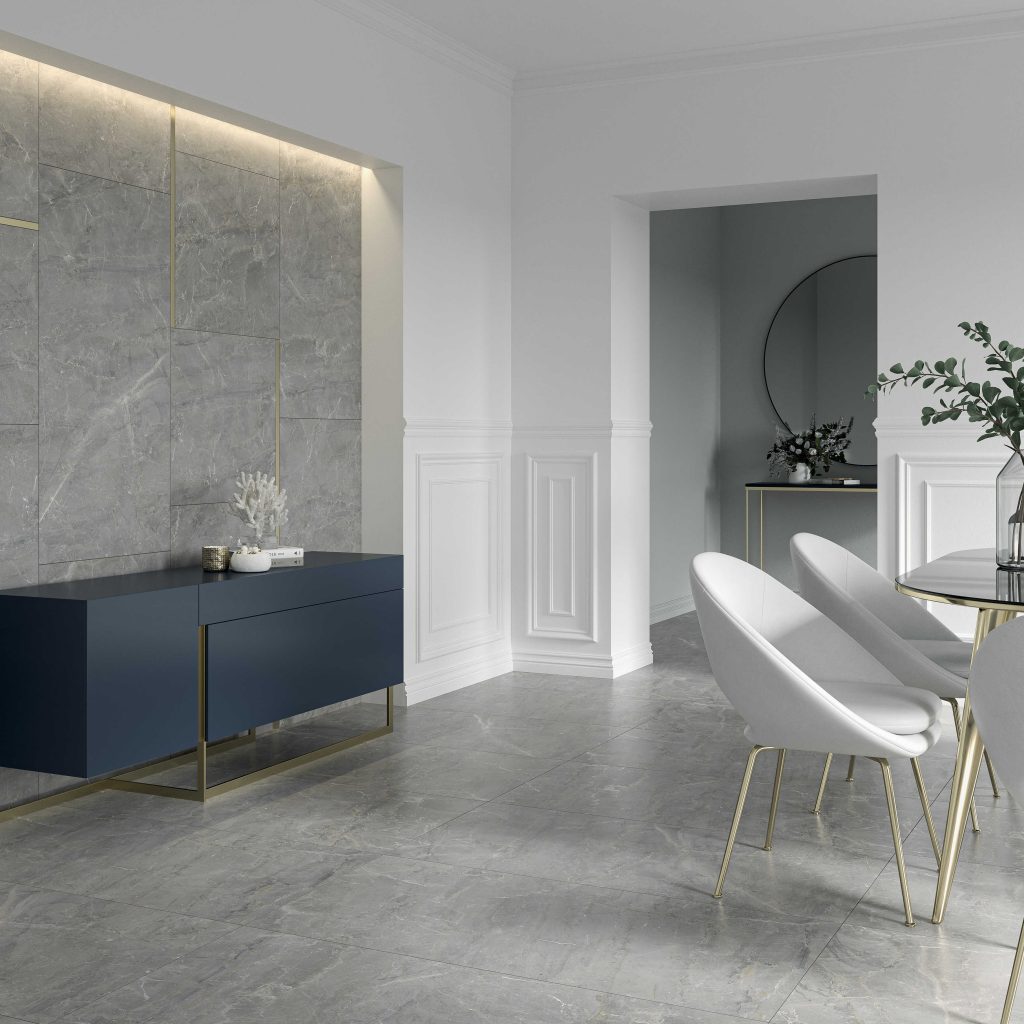 Kolekcja Marvelstone to inspirowane pięknem marmuru połączenie wysublimowanych, przenikających się w nietuzinkowy sposób odcieni szarości oraz ekspresyjnych wzorów z białych, błyszczących żyłek mieniących się na powierzchni płytki. Minimalistyczne wzornictwo oraz kolorystyka kolekcji doskonale wpisują się w najgorętsze trendy wnętrzarskie i dają szereg możliwości aranżacyjnych. Dzięki połączeniu wyrazistości i szlachetności naturalnego kamienia domowa przestrzeń stanie się miejscem, w którym możemy nabierać sił. Użylona grafika zamknięta w płytce ceramicznej idealnie skomponuje się z naturalnym drewnem, tworząc wyrafinowany duet surowego piękna z ciepłymi detalami.