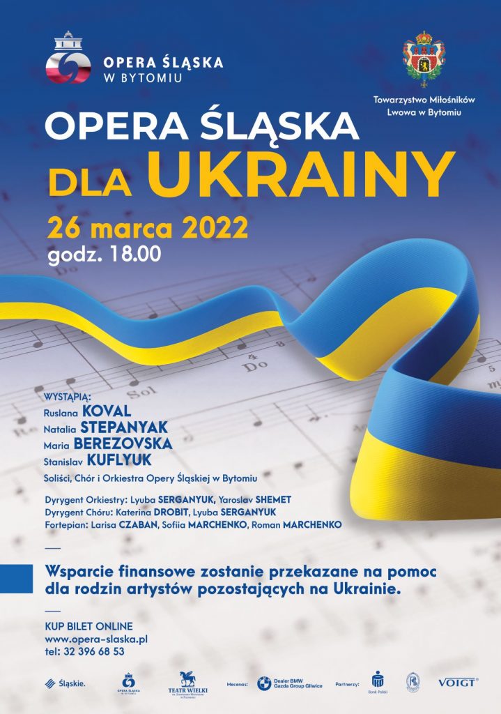 Opera Śląska od samego początku inwazji rosyjskiej na Ukrainę, wspiera wielopłaszczyznowo uciekających z kraju sąsiadów, pomagając im odnaleźć się w nowej rzeczywistości. Wspieramy Ukraińców i Ukrainki zapewniając tymczasowe miejsca noclegowe, pomagając w tłumaczeniach spraw organizacyjnych, dostarczając środki pierwszej potrzeby, a teraz zapraszając na wyjątkowy koncert „Opera Śląska dla Ukrainy”, który odbędzie się 26 marca o godz. 18:00 w Sali koncertowej im. Adam Didura. Do udziału, w tym wydarzeniu zaprosiliśmy bliskie nam artystki i artystów z Ukrainy. Podczas koncertu usłyszymy arie, pieśni i muzykę ukraińską, poprzez którą chcemy okazać naszym sąsiadom nie tylko duchowe wsparcie, ale przede wszystkim zorganizować i przekazać realną pomoc. Dlatego wsparcie finansowe z koncertu dzięki fundacji Towarzystwo Miłośników Lwowa w Bytomiu przekazane zostanie na pomoc dla rodzin Artystów z Lwowa, Iwano-Frankiwska i Chmielnickiego pozostających na Ukrainie.