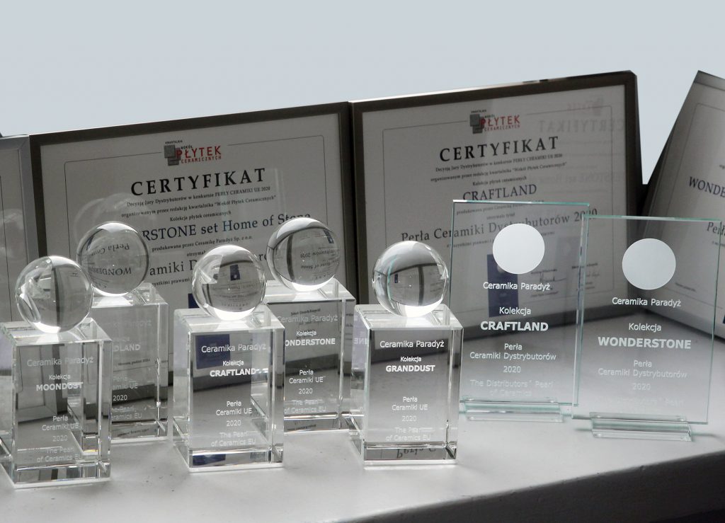 W tej edycji konkursu szczególnie doceniono pełną elegancji, wyjątkową kolekcję Wonderstone oraz nawiązującą do natury kolekcję Craftland o grafice spękanego drewna. Obie propozycje zdobyły po dwie statuetki: Perłę Ceramiki UE 2020 oraz Perłę Dystrybutorów 2020. Tytuł Perła Ceramiki UE 2020 otrzymały także inne ubiegłoroczne wdrożenia polskiego producenta. Wśród nich znalazły się wchodzące w skład inspirowanego cementem setu Home of Concrete kolekcje Granddust oraz Moondust. Nagrodzono także urzekającą grafiką deski kolekcję Wildland oraz kolekcję Smoothstone z najnowszego setu Home of Stone, inspirowanego szlachetnym kamieniem. Nagrody w imieniu firmy odebrały dr Anna Tępińska–Marcinek, współwłaścicielka i członkini Zarządu Ceramiki Paradyż oraz Aldona Chudzicka, dyrektor działu rozwoju produktu w Ceramice Paradyż.