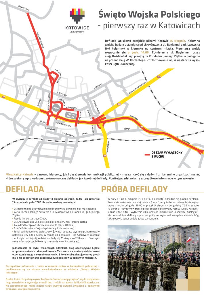 Defilada wojskowa przejdzie ulicami Katowic 15 sierpnia. Kolumna wojska będzie ustawiona od skrzyżowania ul. Bagiennej z ul. Lwowską (tył kolumny) w kierunku na centrum miasta. Przemarsz wojsk rozpocznie się o godz. 14.00. Żołnierze z ul. Bagiennej, przez al. Roździeńskiego przejdą na Rondo im. Jerzego Ziętka, a następnie na północ aleją W. Korfantego. Rozformowanie wojsk nastąpi na wysokości Pętli Słonecznej.
