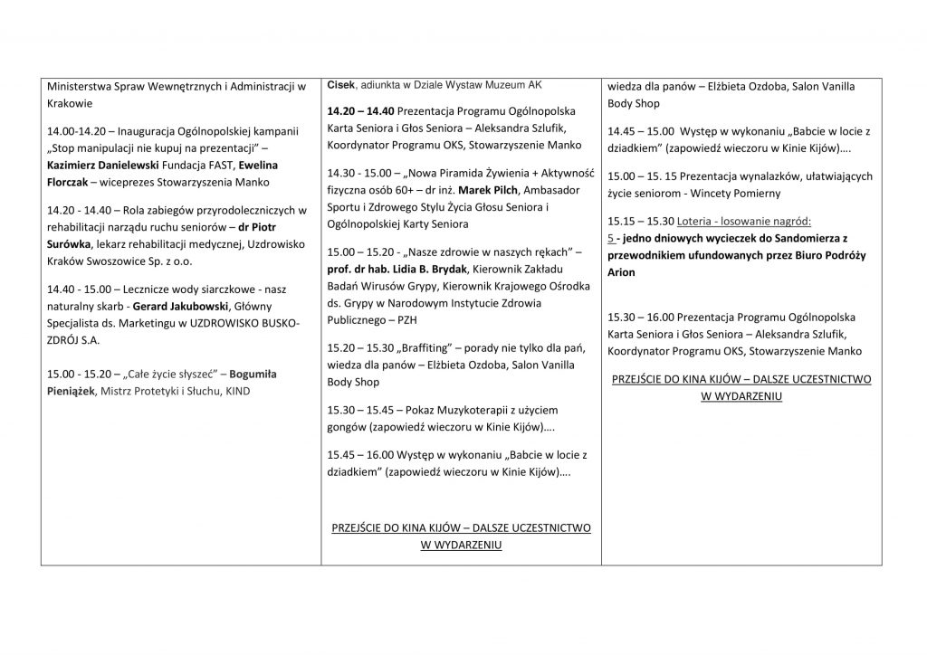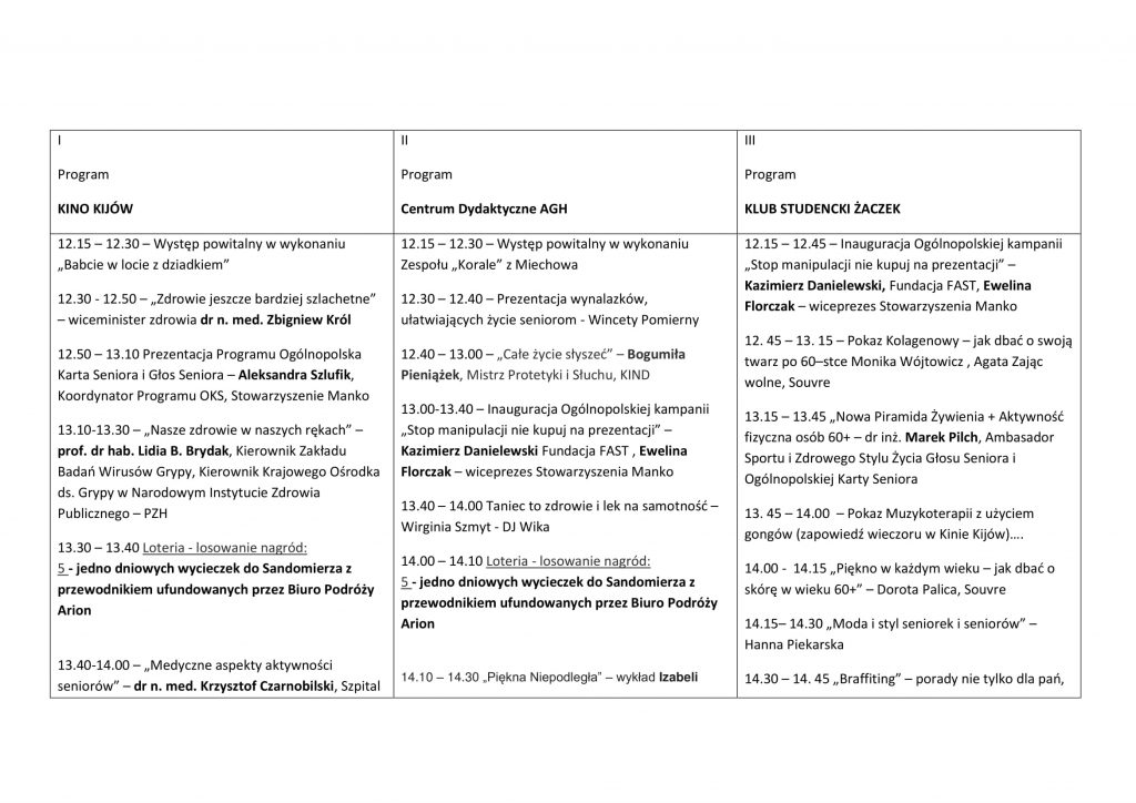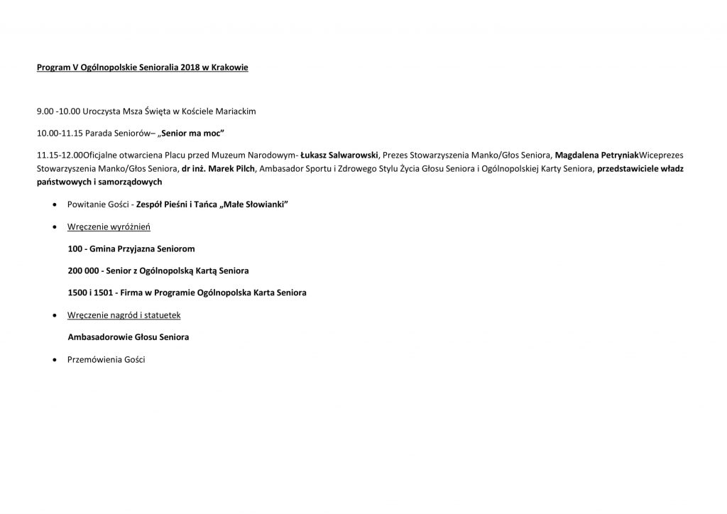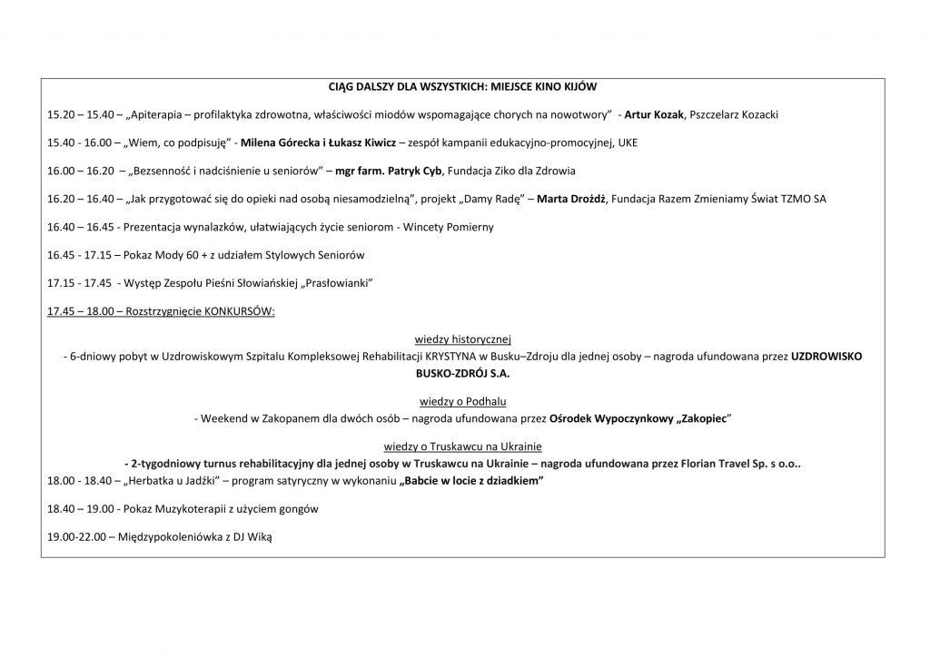 Podczas wydarzenia zostaną rozdane nagrody dla najaktywniejszych 20 seniorów w Polsce oraz nastąpi inauguracja 4 ogólnopolskich kampanii: Stop manipulacji, nie kupuj na prezentacji!, Patriotyczny Głos Seniora – Śladami Niepodległej, Przedsiębiorczy Senior oraz Senior Wynalazca.