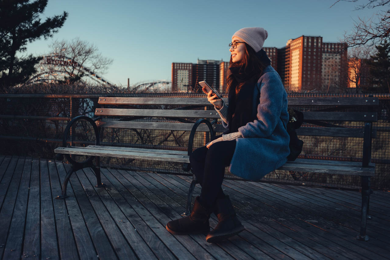 Young attractive girl in warm clothes holding mobile phone while sitting on bench and looking away