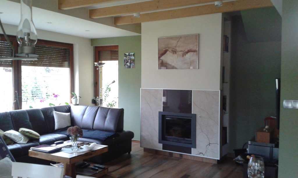 Musi jeszcze znaleźć czas na dobór materiałów. – Posiłkowałam się moją panią architekt, ale pewne rzeczy to ja musiałam wybierać i załatwiać i decydować o kluczowych sprawach –gdzie będą gniazdka lampy kinkiety. Czasami człowiek stawał wobec stresujących problemów, niespodziewanych sytuacji. Zdarza się np. że piec, który niedawno został zamontowany nagle przestaje działać. Dzieje się to podczas wyjazdu na narty. Jest mroźna zima i kiedy wraca do domu z synem zastaje w swoim gniazdku „lodownię”, chociaż piec był ustawiony na temperaturę pokojową. Okazuje się, że zepsuł się z takiego powodu, że przełączono prąd budowlany na standardowy. Jest niedziela, zima, a piec nie działa, no ale ratuje ich kominek. Śpią na dole na kanapie, a w poniedziałek fachowcy usuwają problem. Używa kominka regularnie w weekendy, sama opala go drewnem, dzięki czemu obniża koszty ogrzewania, które teraz wychodzą jej znacznie taniej niż w poprzednim mieszkaniu. Poza tym uwielbia ten iskrzacy ,ciepły klimat ‘’ogniska domowego’’, którego sama jest autorem.